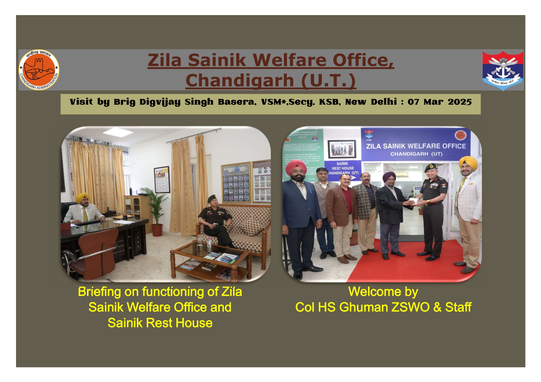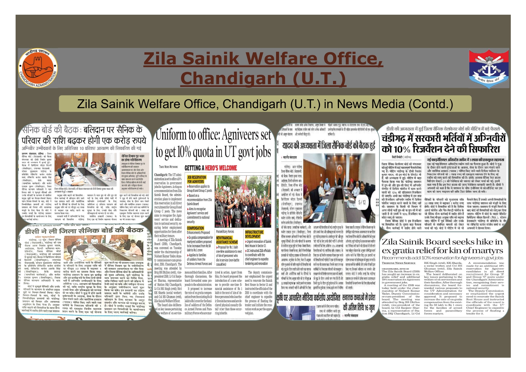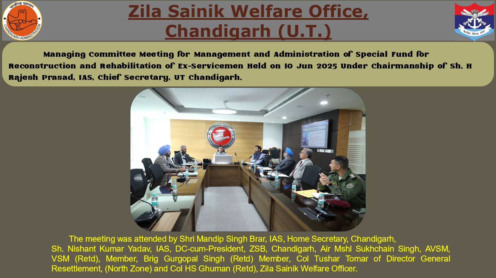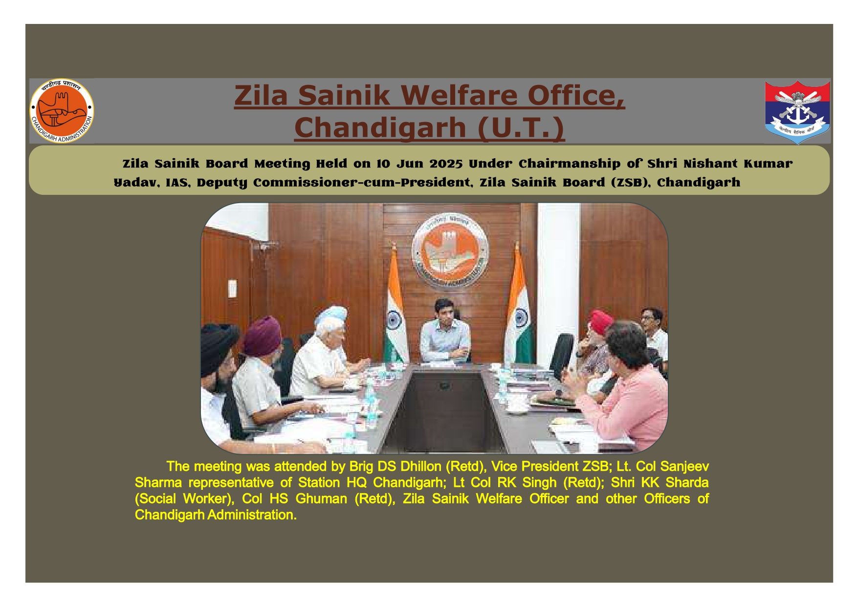 Zila Sainik Board (UT) was constituted on 01 Apr 1978 to look after the welfare and resettlement of Ex-servicemen, servicemen, widows and their dependents residing in UT Chandigarh. Prior to 1978 they were being looked after by the District Soldiers, Sailors & Airmen Board, Ambala Cantt.